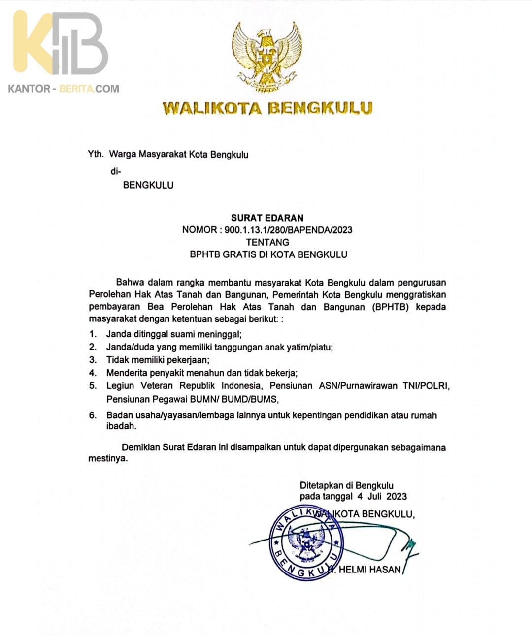 KANTOR-BERITA.COM, KOTA BENGKULU – Kebijakan Walikota Bengkulu Helmi Hasan melalui Surat Edaran nomor 900.1.13.1/280/Bapenda/2023 mengenai penggratisan Bea Perolehan Hak Atas Tanah dan Bangunan (BPHTB) dengan syarat dirasakan manfaatnya oleh masyarakat Kota Bengkulu.